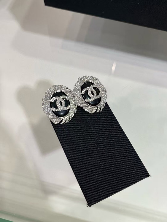 Celine black oval button silver full diamond double C earrings-3900