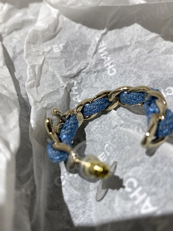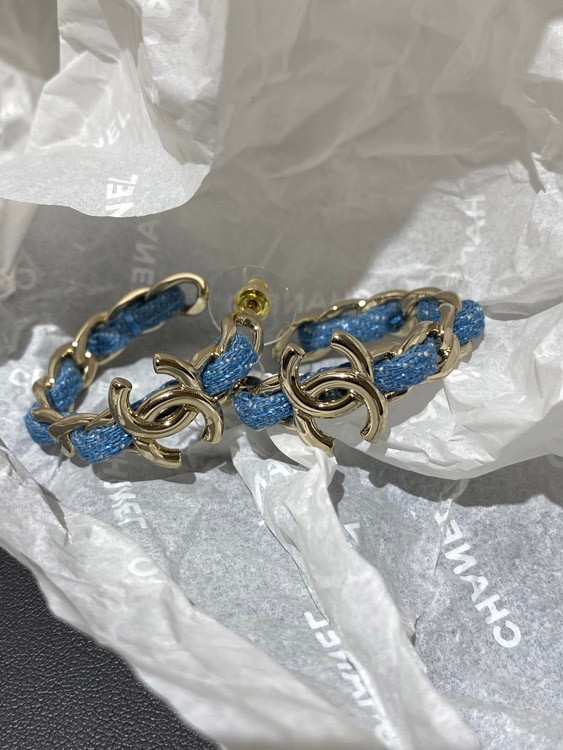 Chanel Light Gold Denim Blue Hoop Earrings-3595